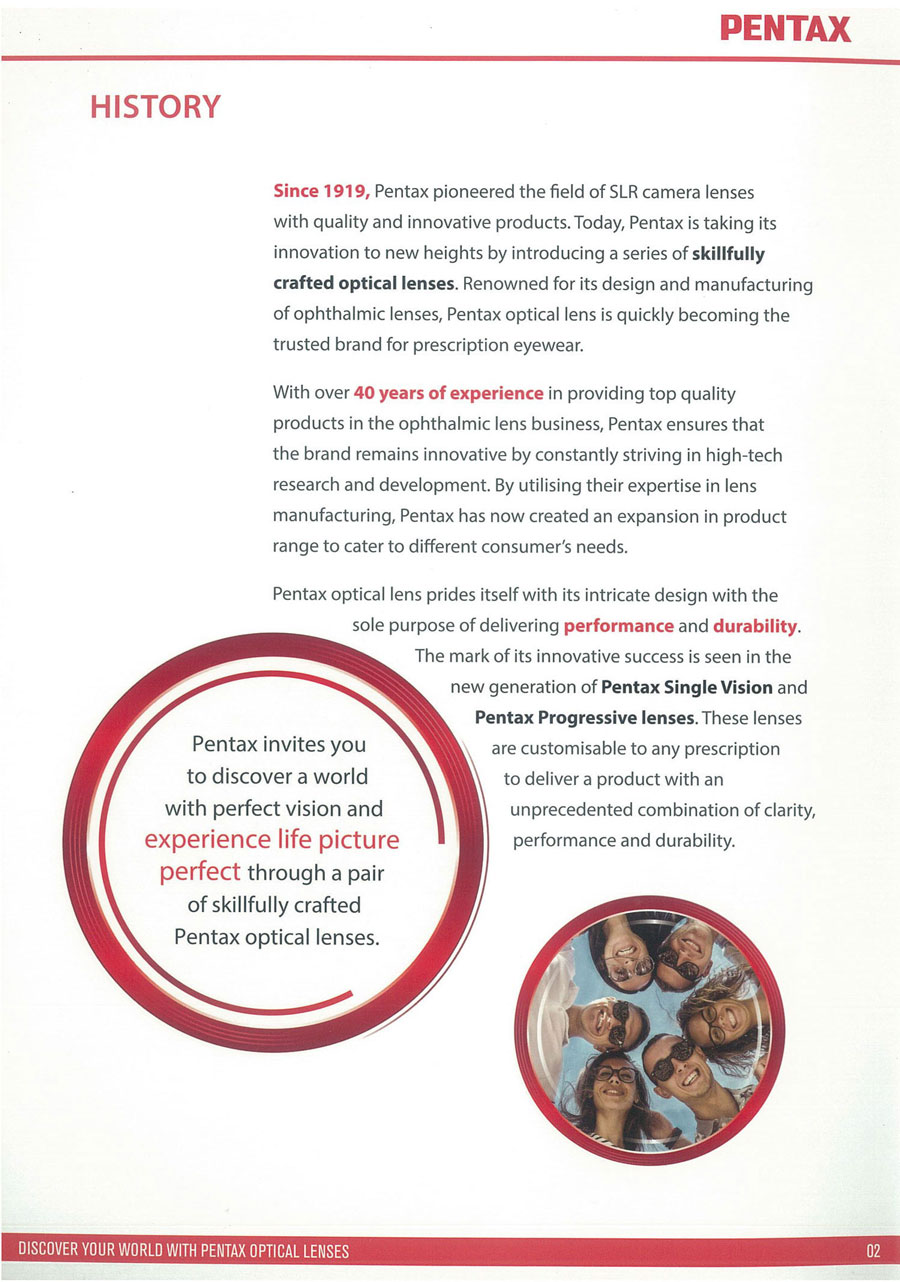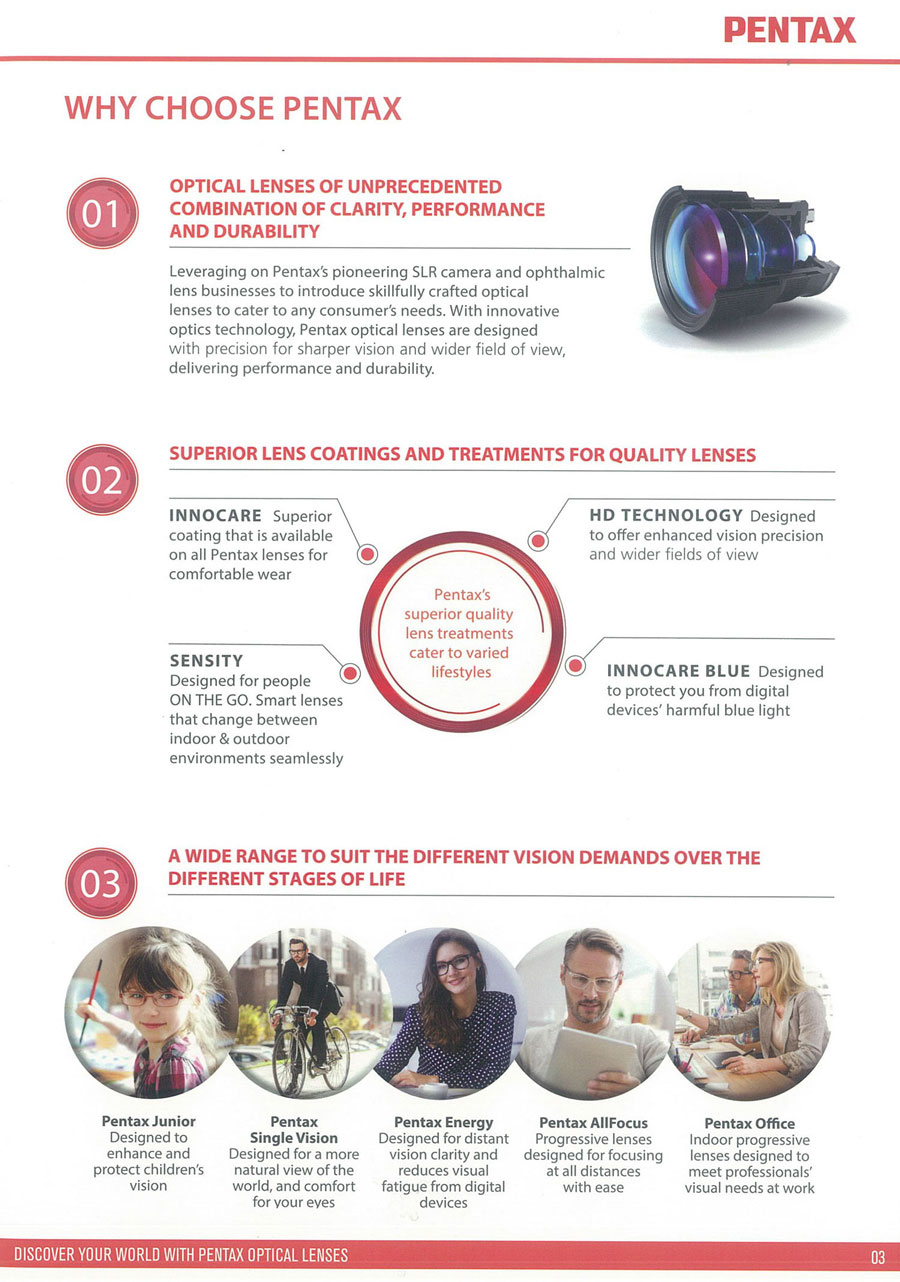 With over 40 years of experience in providing top quality products in the ophthalmic lens business, Pentax ensures that the brand remains innovative by constantly striving in high-tech research and development. By utilising their expertise in lens manufacturing, Pentax has now created an expansion in product range to cater to different consumer’s need.